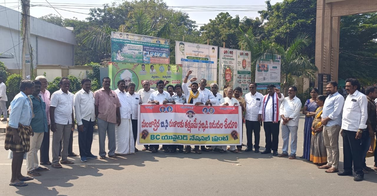 A protest was organized on Monday in front of the Kadapa Collector’s Office under the auspices of the BC United National Front. During the demonstration, a petition was submitted to the District Revenue Officer (DRO) through the public grievances program, urging the government to expedite the release of subsidy loans promised under self-employment schemes.