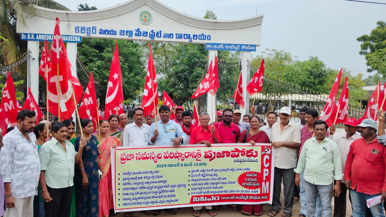 Amalapuram – Andhra Pradesh: In a powerful protest at the Amalapuram District Collector’s Office on Thursday, the CPI(M) led a public demonstration addressing the soaring prices of essential commodities, employment issues, local infrastructural needs, and the failures of coalition governments to fulfill election promises. CPI(M) leaders called for immediate government action on these issues, advocating for fair prices, job opportunities, and essential resources to ease the burdens on citizens.