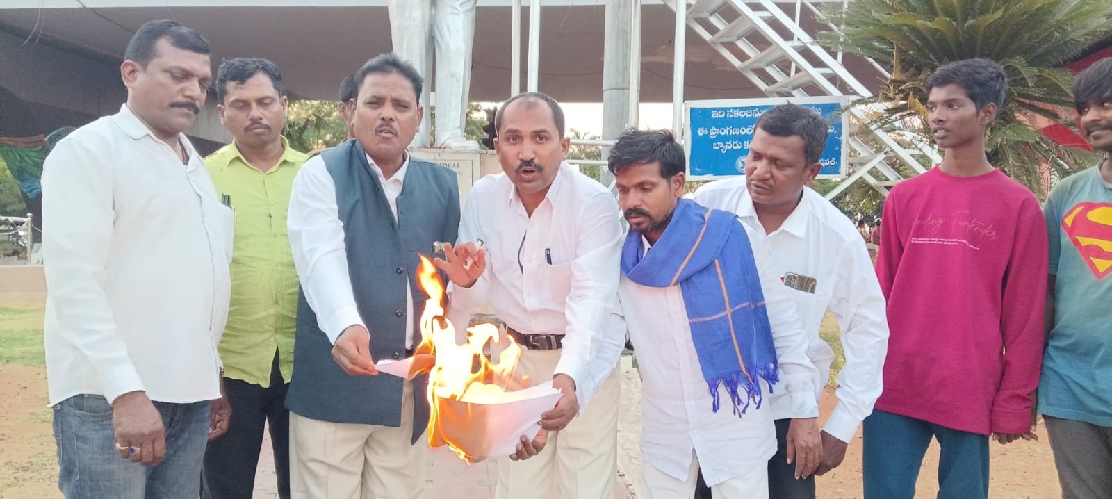 Hyderabad: Leaders of the SC Anti-Classification Struggle Committee and Mala Mahanadu Netakani Mahar staged a protest on Wednesday at the Ambedkar statue near Tank Bund Liberty Center, Hyderabad. They burned copies of the Assembly resolution supporting SC classification and accused the Congress-led Revanth Reddy government of betraying Dalit interests.