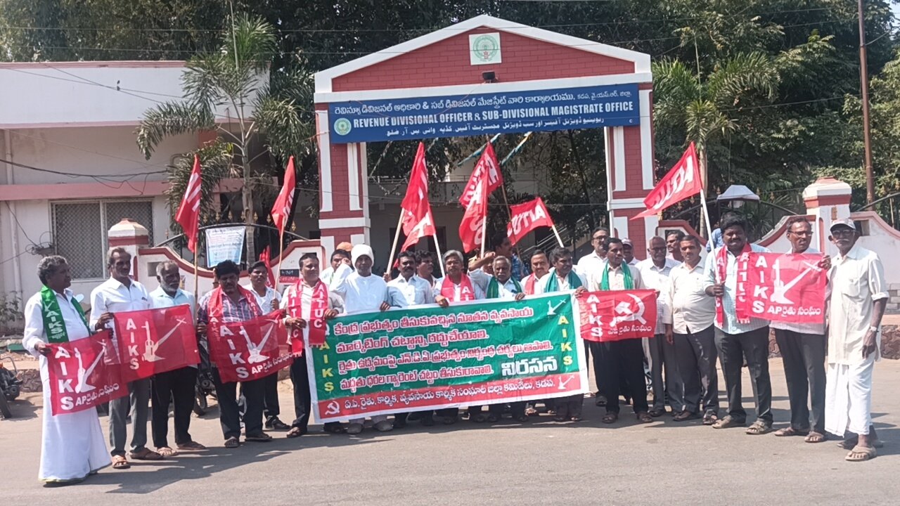 Kadapa – Andhra Pradesh: In response to a nationwide call by the Samyukta Kisan Morcha (SKM), farmers’ associations, trade unions, agricultural labour unions, and tribal organizations staged a protest at the Kadapa Revenue Division Office (RDO) on Wednesday. The demonstration, led by Andhra Pradesh Farmers’ Union (AIKS) Kadapa District President MV Subbareddy, demanded an end to anti-farmer and anti-labour policies.