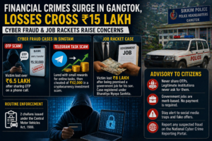 Gangtok-New Delhi : Authorities in Gangtok have reported a sharp increase in financial crimes, as multiple cases of cyber fraud and job racketeering have surfaced in recent days, resulting in losses exceeding ₹15 lakh. The incidents have prompted police to issue a public advisory, warning citizens to remain vigilant against increasingly sophisticated fraud tactics that exploit technology, social media platforms, and false promises of employment.