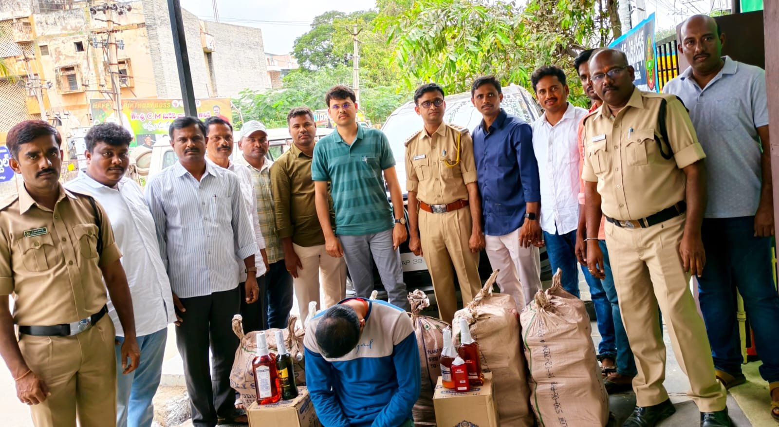 During the raid, officials found illegal liquor stored in a four-wheeler vehicle. While two suspects managed to flee, one person was apprehended in the presence of panchayat witnesses. The arrested individual was identified as Anumalaguthi Venkata Siva (30), a resident of Proddatur. The absconding accused were identified as Katam Veerendra and Mangapatnam Suman.
