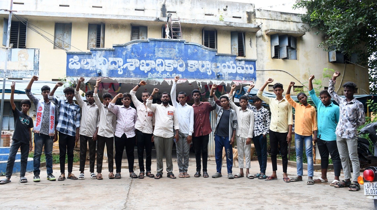Kadapa – Andhra Pradesh: The Revolutionary Students Federation (RSF) staged a protest on Thursday in front of the District Education Office (DEO), demanding accountability from the management of Vigyan School after a school bus accident in Vallur mandal left 45 students injured.