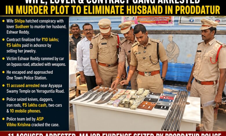Proddatur – Andhra Pradesh: In a shocking case from Proddatur, police have foiled a meticulously planned murder conspiracy in which a woman allegedly plotted to eliminate her husband with the help of her lover and a hired gang. Eleven accused have been arrested after the victim narrowly escaped a deadly attack and sought timely police assistance.