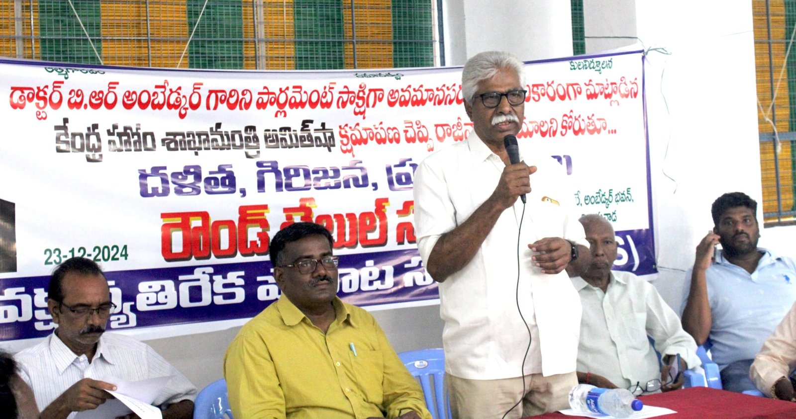 A roundtable meeting was held at Phule Ambedkar Bhavan in Vijayawada under the chairmanship of Andra Malyadri, State General Secretary of the Anti-caste Discrimination Struggle Society (KVPS). Leaders from Dalit, tribal, labour, youth, women’s organizations, and intellectuals gathered to condemn Amit Shah’s recent comments in the Rajya Sabha regarding Dr. B R Ambedkar.