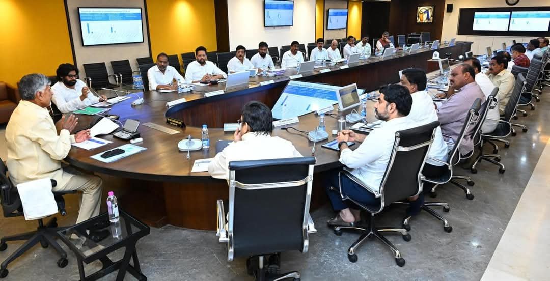 The meeting was attended by Deputy CM Pawan Kalyan, Chief Secretary Neerab Kumar Prasad, and ministers Atchannaidu, TG Bharat, Kandula Durgesh, and others, alongside officials and industry representatives.
