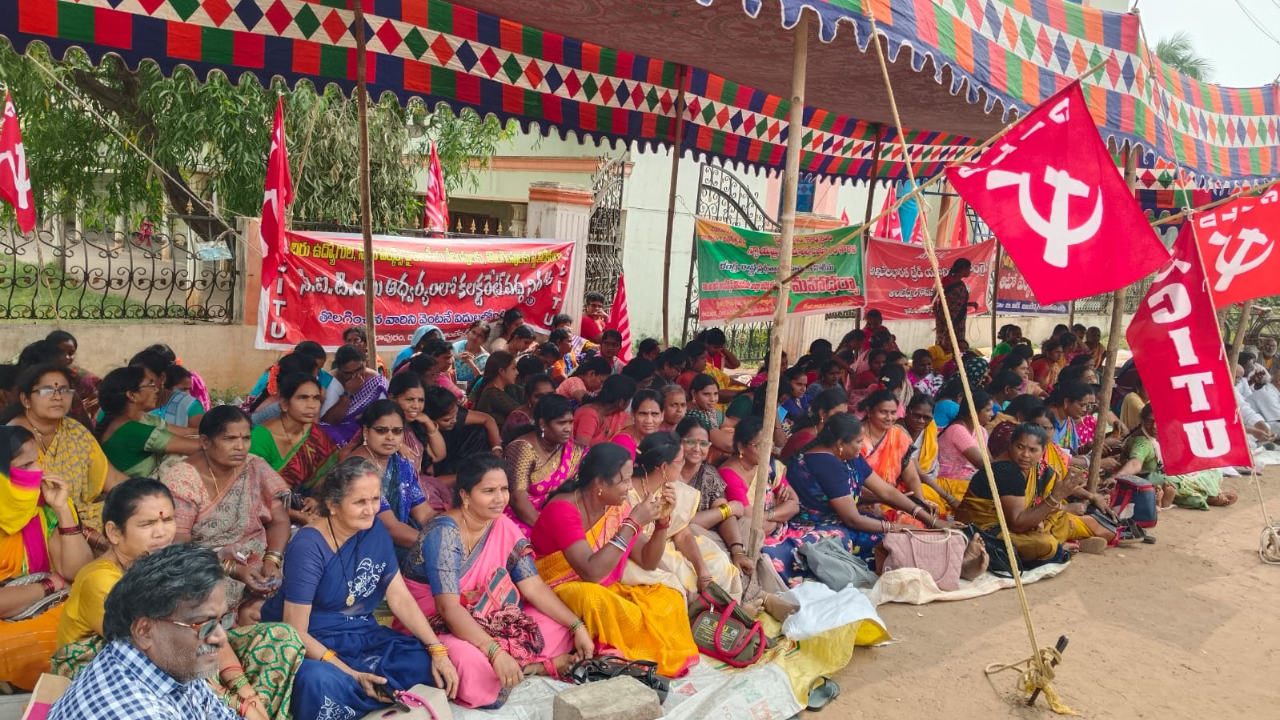 The Mahadharna, held under the auspices of CITU, AITUC, and agricultural labor unions, was chaired by CITU District President N Balaram, Secretary G Durga Prasad, and AITUC District General Secretary Vasamsetty Satthiraju. State leaders including KVPS State Secretary Andra Malyadri and Agricultural Labor Union State President Dadala Subbarao also addressed the gathering.